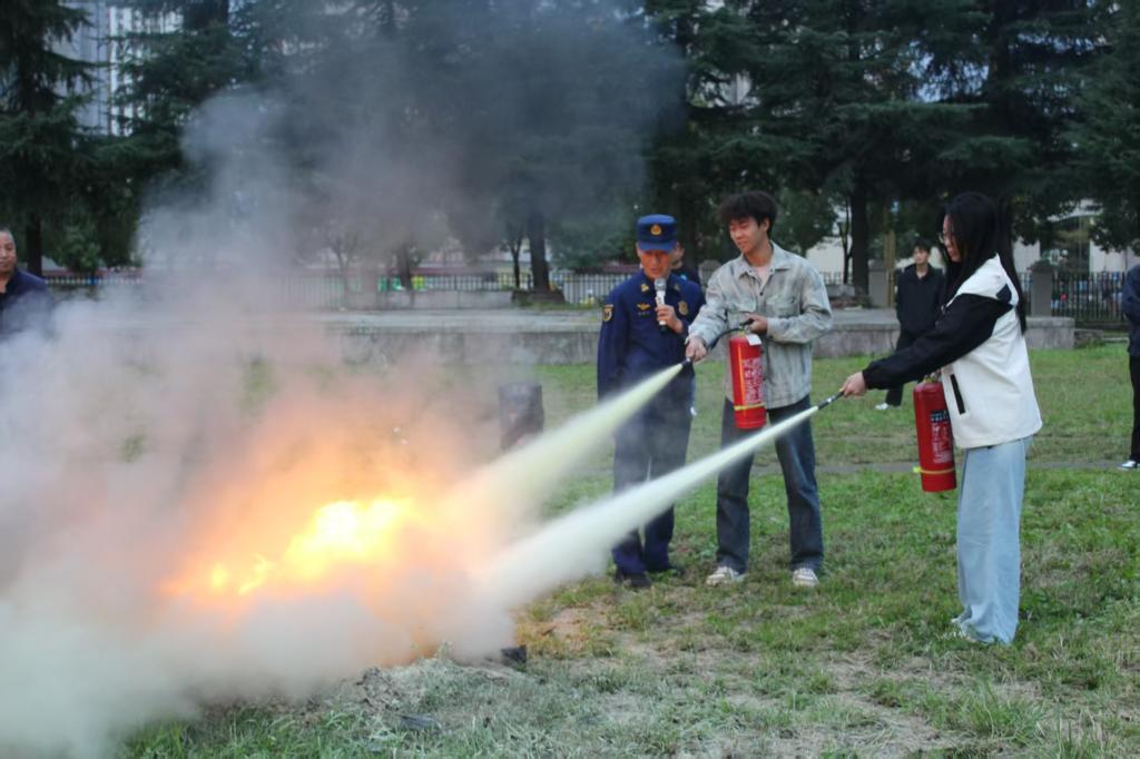疏散结束后,成县消防中队指战员为师生进行了灭火器使用实操培训,通过“提、拔、握、压”四字口诀讲解使用方法,并现场点燃模拟火源。师生代表轮流上前进行实操体验,切实掌握了扑救初期火灾的关键技能。