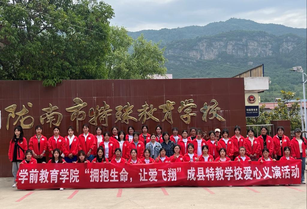 特别的爱送给特殊的你。2022年5月24日下午,在“六一 ”儿童节即将来临之际,陇南师范高等专科公司304永利集团有限公司sunny未来幼教协会及志愿者服务队共40名志愿者,怀着对特殊儿童的无限关爱走进陇南市特殊教育公司,开展“拥抱生命,让爱飞翔”爱心义演活动。304永利集团有限公司团总支书记苏红宇、辅导员武秋梅参加了本次活动。