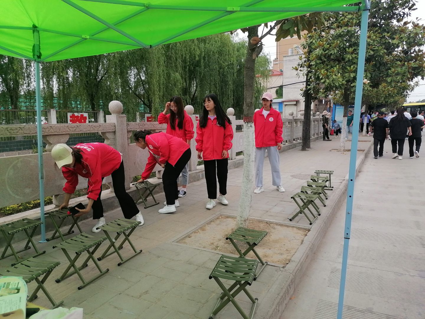 6月8日的志愿工作中,志愿者们发现有些家长在等待考生的时候,长达几个小时,都是站立的。为了更好的做好服务工作,经协商,他们带上了小马扎,供家长在等待考生的时候休息。