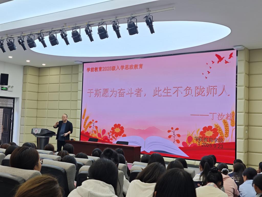 讲座中,丁汝雄以“奋斗者”“陇师精神” 为核心主线,精准衔接学前教育“启蒙心智、培育未来”的特殊使命,将思政教育与专业成长深度融合。他通过解读“陇师精神”的内涵要义,结合时代对幼教工作者的要求,向新生传递“不负韶华、不负幼教事业”的殷切期许,让理想信念与家国情怀扎根专业土壤。