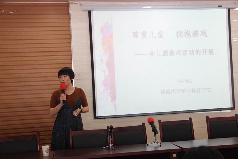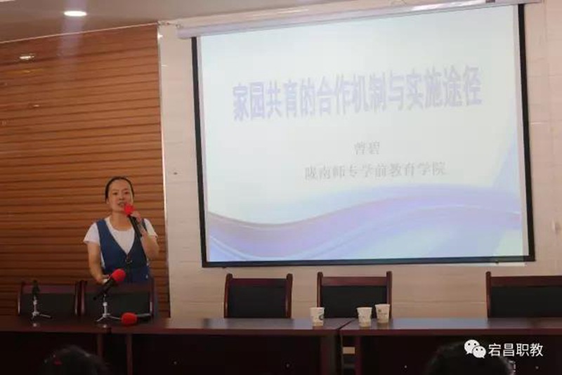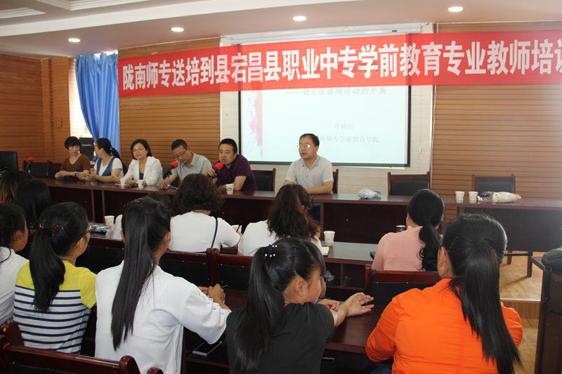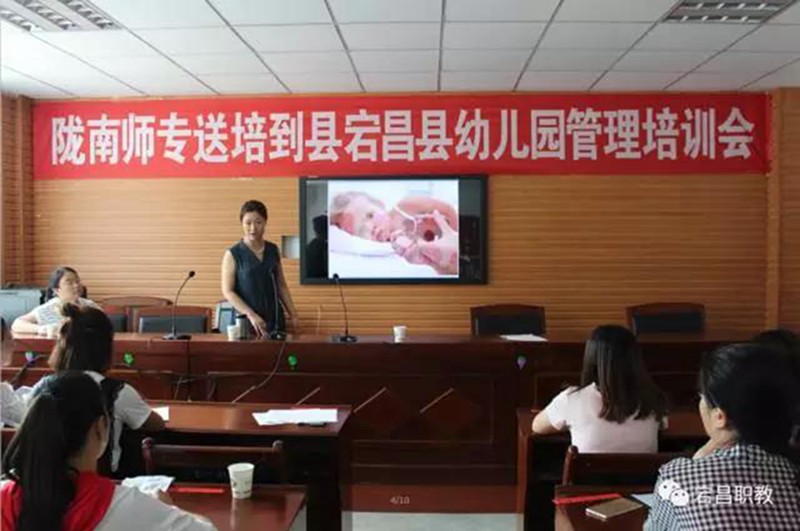 培训活动分别在宕昌县职业中专两个报告厅同时举行。在陇南师专送培到县宕昌县职业中专学前教育专业教师培训会上,王小会、李霞副分别就学前教育专业建设和发展前景做了重要发言,副教授牛桂红、曾碧分别做了《尊重儿童,拥抱游戏--幼儿园游戏活动的开展》和《家园共育的合作机制与实施途径》的专题讲座。会议由宕昌县职业中学董事长李若鸿主持,县职业中专学前教育专业专任教师、附属幼儿园全体教师和县职业中专学前教育专业全体员工共180余人参加了培训。培训给学前教育专业员工的职业成长开拓了新思路,对游戏活动开展和家园共育的路径现场进行了讲解和分析,激发了员工们热烈的兴趣。